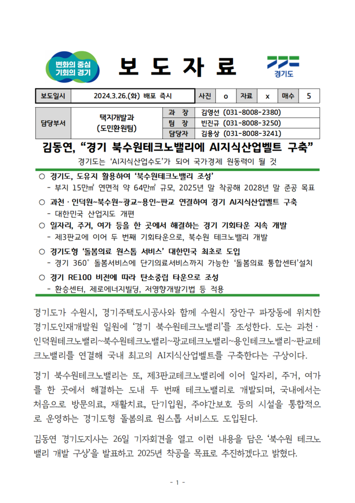 경기 북수원테크노밸리는 또, 제3판교테크노밸리에 이어 일자리, 주거, 여가를 한 곳에서 해결하는 도내 두 번째 테크노밸리로 개발되며, 국내에서는 처음으로 방문의료, 재활치료, 단기입원, 주야간보호 등의 시설을 통합적으로 운영하는 경기도형 돌봄의료 원스톱 서비스도 도입된다.