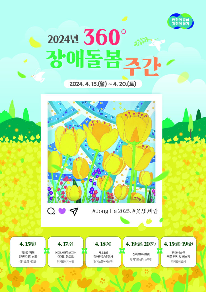 이번 주간은 ▲15일, 장애인정책 5개년 계획 선포 ▲17일, 지난 장애인 기회소득 성과와 360〬 어디나돌봄 ‘야간・휴일 프로그램’ 개강을 축하하는 360〬 어디나돌봄 ‘어디나 따뜻해지는 어게인 봄 토크’ ▲18일, 제44회 경기도 장애인의날 기념식 ▲19일, 20일 장애인 기회소득 우수수례 선정자 초청 장애연극 관람 등으로 진행된다. 또한, 15일부터 19일까지 5일간 경기도청 1층 로비에서는 점심과 퇴근 시간대 30분 내외의 장애예술인 공연과 2024년 누림 Art&Work 선정 작품 20점에 대한 전시도 이뤄진다.