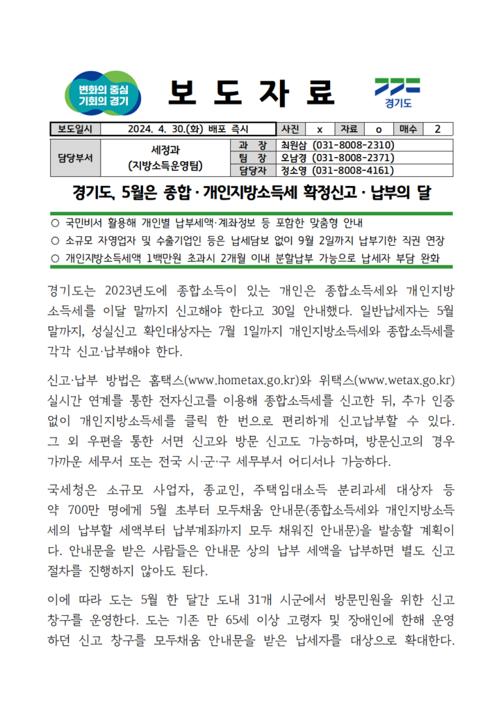 경기도는 2023년도에 종합소득이 있는 개인은 종합소득세와 개인지방소득세를 이달 말까지 신고해야 한다고 30일 안내했다. 일반납세자는 5월 말까지, 성실신고 확인대상자는 7월 1일까지 개인지방소득세와 종합소득세를 각각 신고·납부해야 한다.
