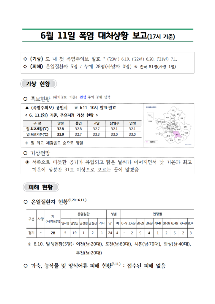 생활 폭염대처 일일상황보고(6.11.) By 남서영 기자 - 2024년 6월 11일 0 30 Facebook Twitter Pinterest WhatsApp 폭염대처 일일상황보고(6.11. 17시 기준)