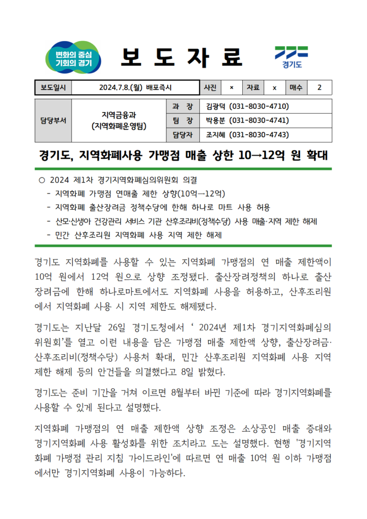 경기도 지역화폐를 사용할 수 있는 지역화폐 가맹점의 연 매출 제한액이 10억 원에서 12억 원으로 상향 조정됐다. 출산장려정책의 하나로 출산장려금에 한해 하나로마트에서도 지역화폐 사용을 허용하고, 산후조리원에서 지역화폐 사용 시 지역 제한도 해제됐다.