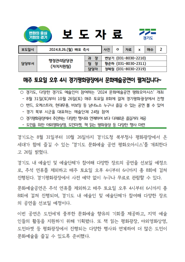 변상기 경기도 행정관리담당관은 “이번 문화예술 공연이 도민에게 즐거운 경험이 되길 바라며, 앞으로도 다양한 문화예술 프로그램을 통해 지역 예술인과 도민 간의 소통을 강화할 것”이라고 말했다.