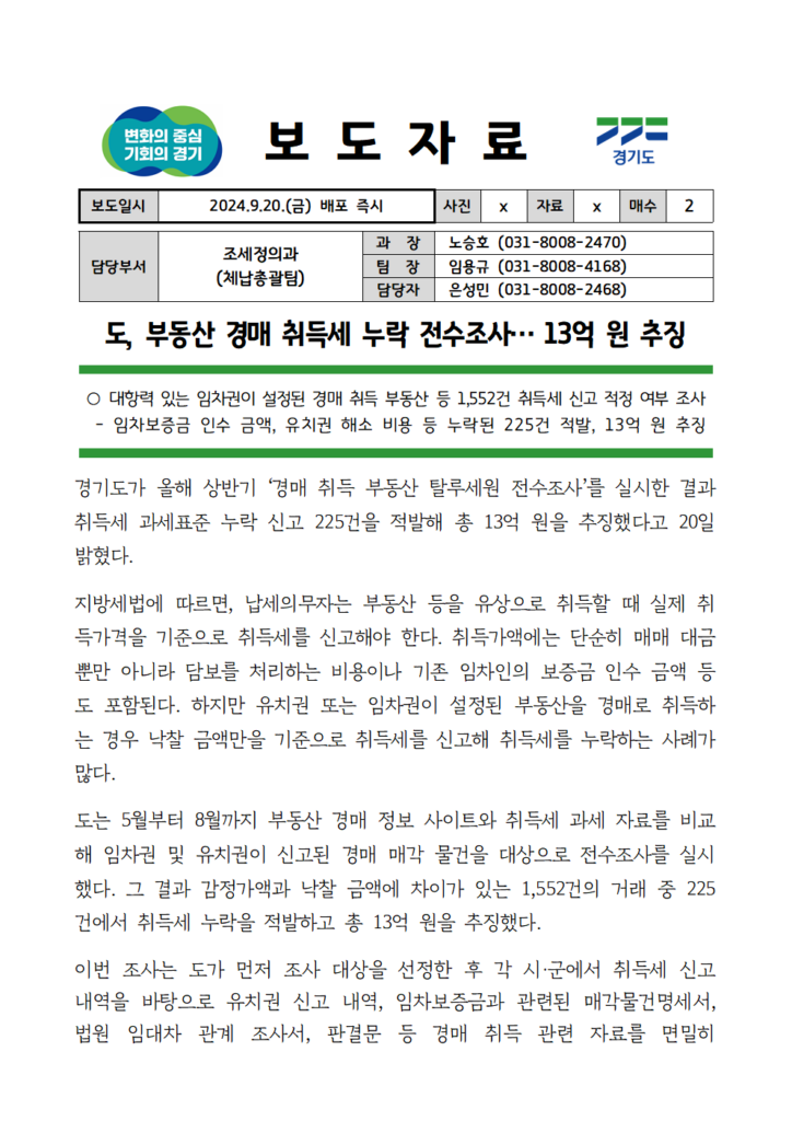도는 5월부터 8월까지 부동산 경매 정보 사이트와 취득세 과세 자료를 비교해 임차권 및 유치권이 신고된 경매 매각 물건을 대상으로 전수조사를 실시했다. 그 결과 감정가액과 낙찰 금액에 차이가 있는 1,552건의 거래 중 225건에서 취득세 누락을 적발하고 총 13억 원을 추징했다.