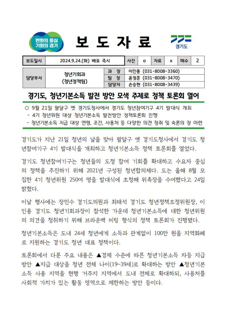 이인용 경기도 청년기회과장은 “이번 토론회에서 나온 청년들의 목소리를 바탕으로 청년들이 기본소득을 더욱 알차게 활용할 수 있는 방안을 마련하겠다”고 말했다.