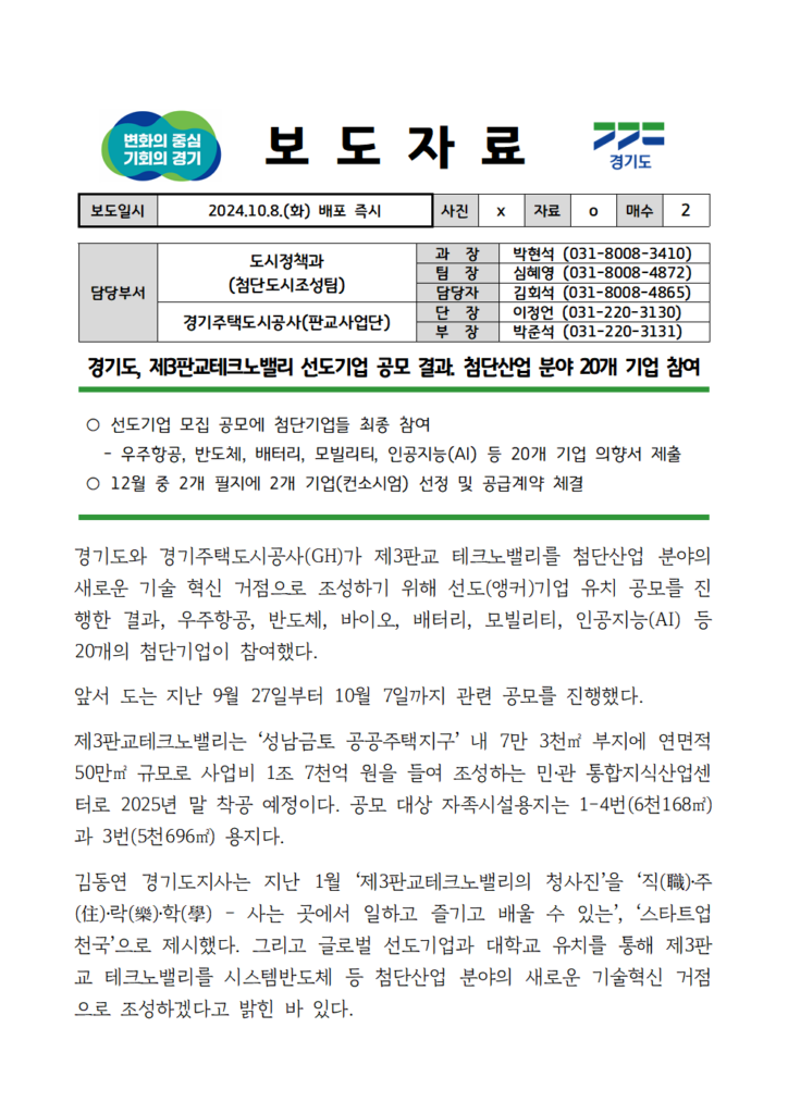 박현석 경기도 도시정책과장은 “제3판교테크노밸리가 시스템반도체 등 첨단산업의 글로벌 리더 기업들과 대학, 연구소들이 함께하는 혁신 클러스터로 자리매김할 것으로 기대한다”고 말했다.