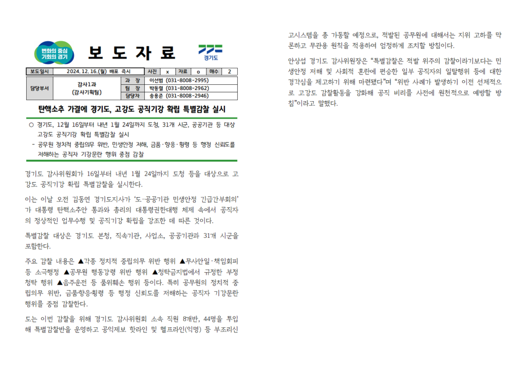 ○ 경기도, 12월 16일부터 내년 1월 24일까지 도청, 31개 시군, 공공기관 등 대상 고강도 공직기강 확립 특별감찰 실시