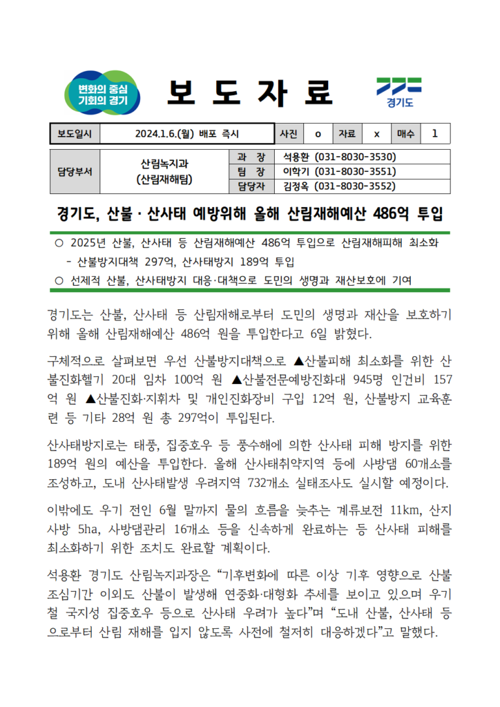 경기도는 산불, 산사태 등 산림재해로부터 도민의 생명과 재산을 보호하기 위해 올해 산림재해예산 486억 원을 투입한다고 6일 밝혔다.