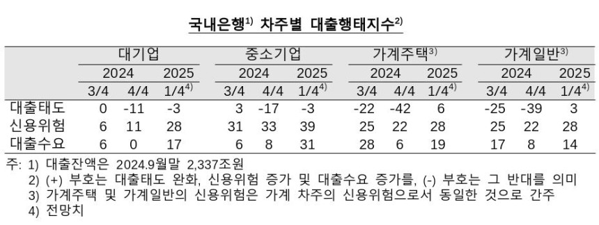 올해 1분기 가계대출 문턱이 지난해 4분기보다 크게 낮아질 것으로 예상됐다. 기업 대출은 여전히 깐깐할 것으로 예상됐는데, 특히나 신용위험이 커진 중소기업에 대한 대출은 더욱 어려워질 것으로 보인다.