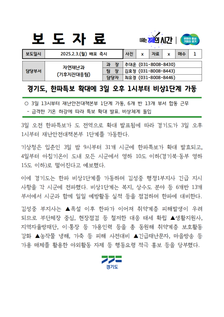 이에 경기도는 한파 비상1단계를 가동하며 김성중 행정1부지사 긴급 지시사항을 각 시군에 전파했다. 비상1단계는 복지, 상수도 분야 등 6개반 13개 부서에서 시군과 함께 일일 예방활동 실적 등을 점검하며 한파에 대비한다.