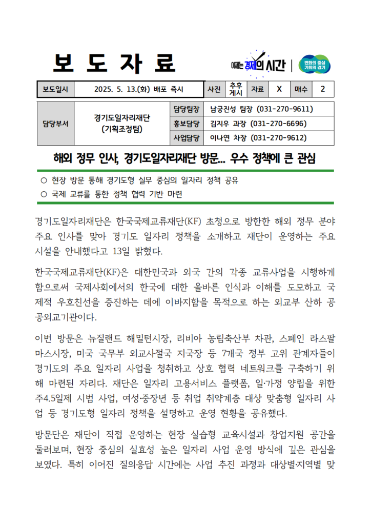 해외 인사들은 “일자리 지원 정책이 지역 상황에 맞게 정교하게 설계된 점이 인상 깊다”, “현장의 수요를 반영한 체계적인 정책 운영이 돋보인다”며 긍정적인 반응을 보였다.