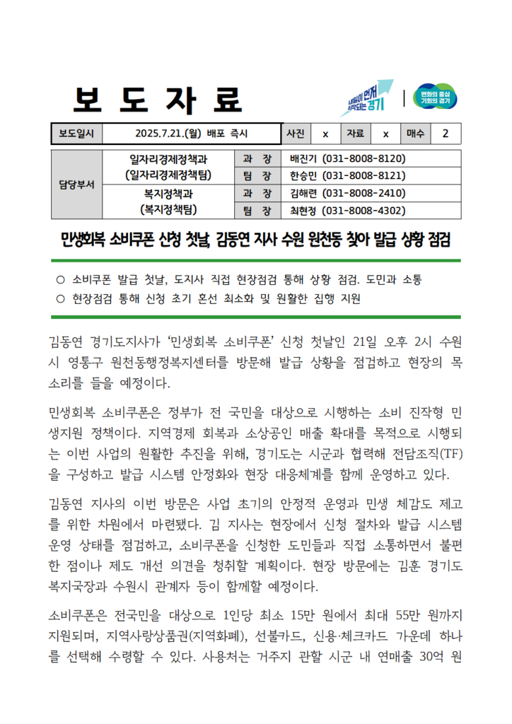 경기도는 이번 소비쿠폰 지급이 현장에서 차질 없이 추진될 수 있도록 전방위적인 지원에 나서고 있다. 도민 누구나 편리하게 신청하고 실질적인 혜택을 체감할 수 있도록 발급 현장을 지속적으로 점검하고, 제도 보완에 힘쓸 방침이다.